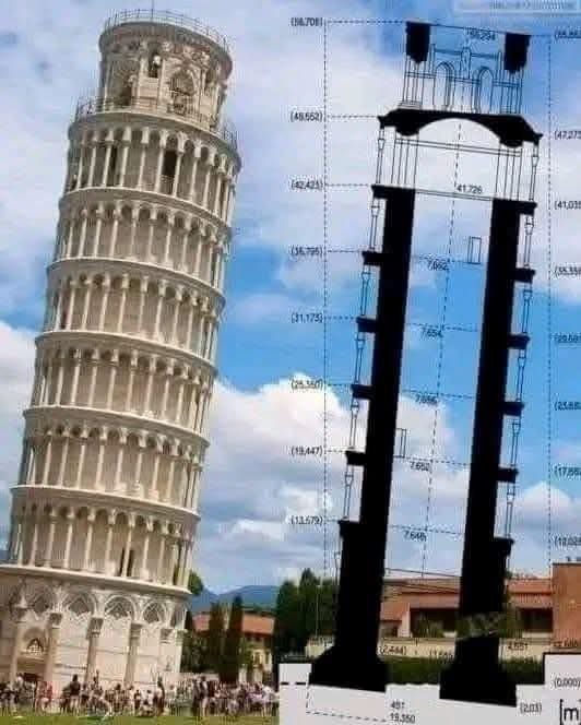 We are talking about a 14,500-ton tower built on a 3-meter-deep foundation resting on sand and mud. Imagine geotechnical studies before construction at that time—barely any. After detecting the tilt, the engineers of that era built the walls of the remaining floors in such a way that the height of the sinking side was greater than the other side, attempting to compensate for the tilt angle.