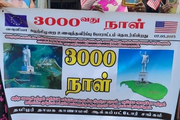 The Association for Relatives of the Enforced Disappearances (ARED) marked 3,000 continuous days of protest in Vavuniya today, demanding justice and accountability for their forcibly disappeared loved ones.