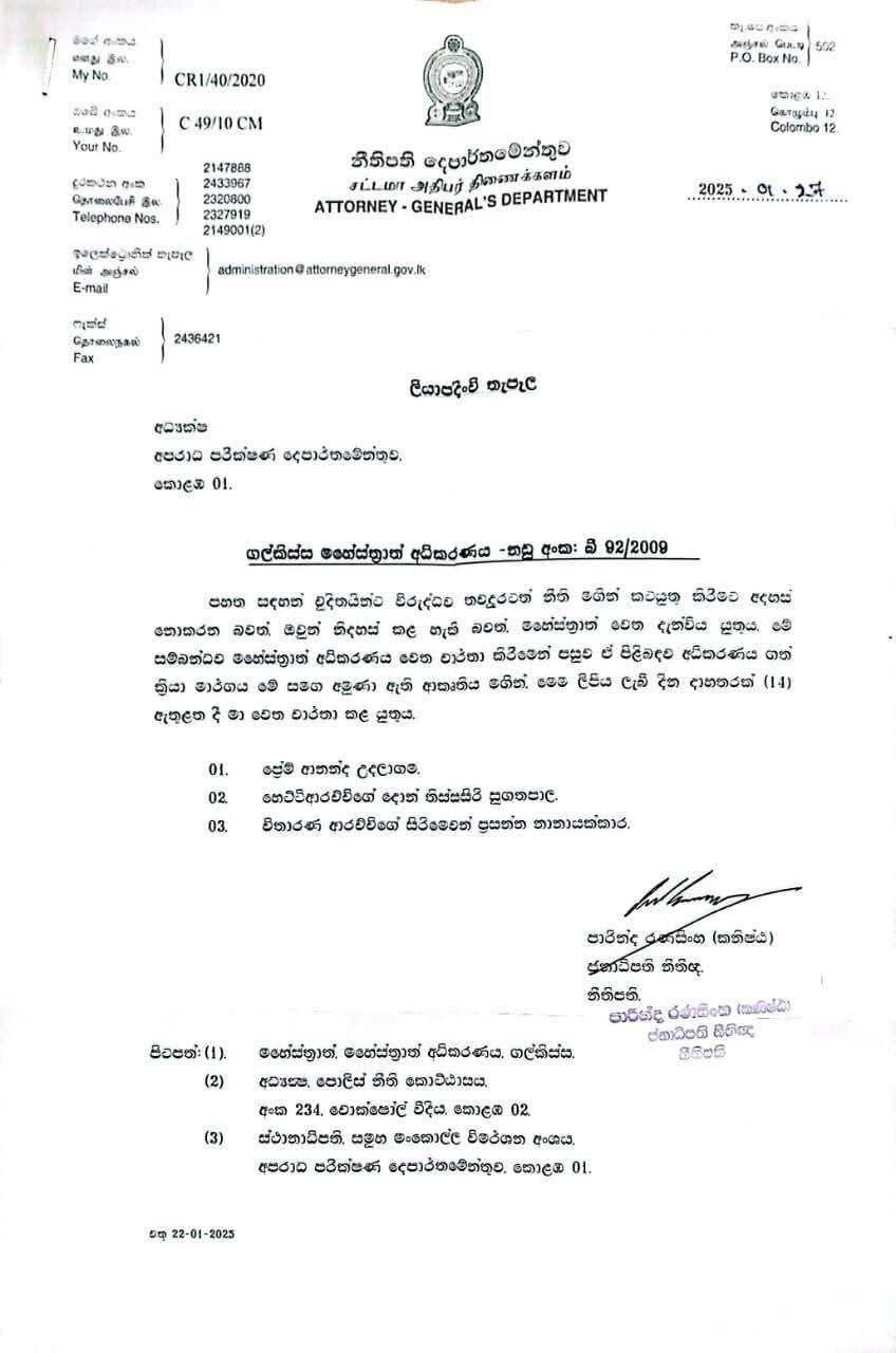 AG Parinda Ranasinghe in his letter dated on January 27, 2025 to the Director CID stated that the prosecution does not intend to pursue further legal action against the three suspects; Staff Sergeant Prem Ananda Udalagama of Army Intelligence Unit, former OIC Crimes Mt. Lavinia Police Sub Inspector Tissasiri Sugathapala and retired DIG Prasanna Nanayakkara, in connection with the magisterial inquiry case number B/92/2009.